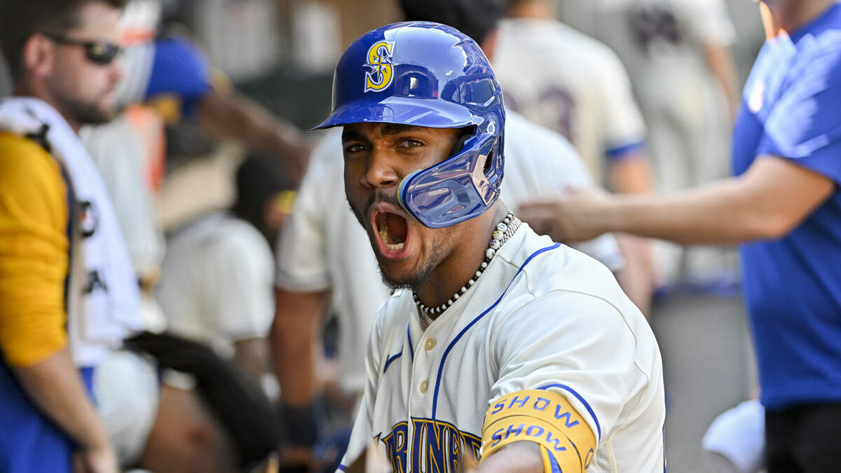 Julio Rodriguez received the pumpkin seeds shower after his second home run in as many days Sunday. He is a lock for American League Player of the Month in August.