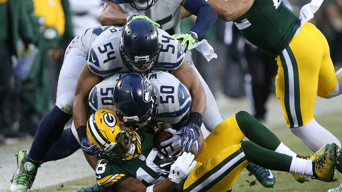 Photo Credit: GREEN BAY, WI - DECEMBER 11: Bobby Wagner #54 and K.J. Wright #50 of the Seattle Seahawks tackle Randall Cobb #18 of the Green Bay Packers during the first half of a game at Lambeau Field on December 11, 2016 in Green Bay, Wisconsin. (Photo by Dylan Buell/Getty Images)