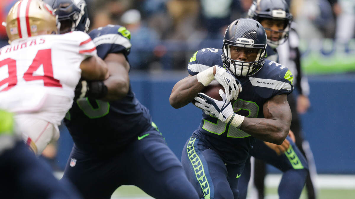 Photo Credit: SEATTLE, WA - SEPTEMBER 17: Running back Chris Carson #32 of the Seattle Seahawks rushes against the San Francisco 49ers during the third quarter of the game at CenturyLink Field on September 17, 2017 in Seattle, Washington. The Seattle Seahawks beat the San Francisco 49ers 12-9. (Photo by Stephen Brashear/Getty Images)