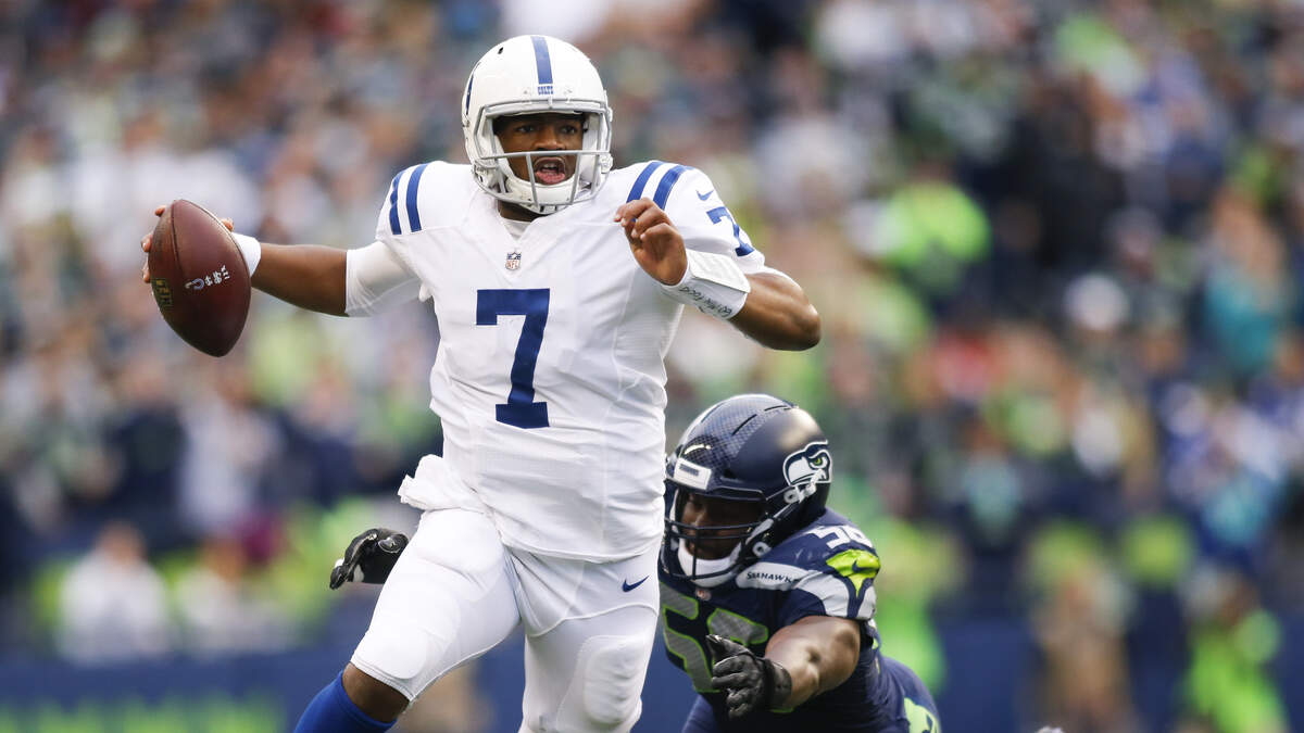 Photo Credit: SEATTLE, WA - OCTOBER 01: Jacoby Brissett #7 of the Indianapolis Colts tries to escape defensive end Cliff Avril #56 of the Seattle Seahawks in the first quarter at CenturyLink Field on October 1, 2017 in Seattle, Washington. (Photo by Jonathan Ferrey/Getty Images)