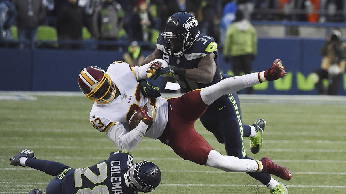 Photo Credit: SEATTLE, WA - NOVEMBER 05: Wide receiver Brian Quick #83 of the Washington Redskins is tackled by cornerback Justin Coleman #28 and strong safety Kam Chancellor #31 of the Seattle Seahawks during the fourth quarter of the game at CenturyLink Field on November 5, 2017 in Seattle, Washington. The Redskins won 17-14. (Photo by Steve Dykes/Getty Images)