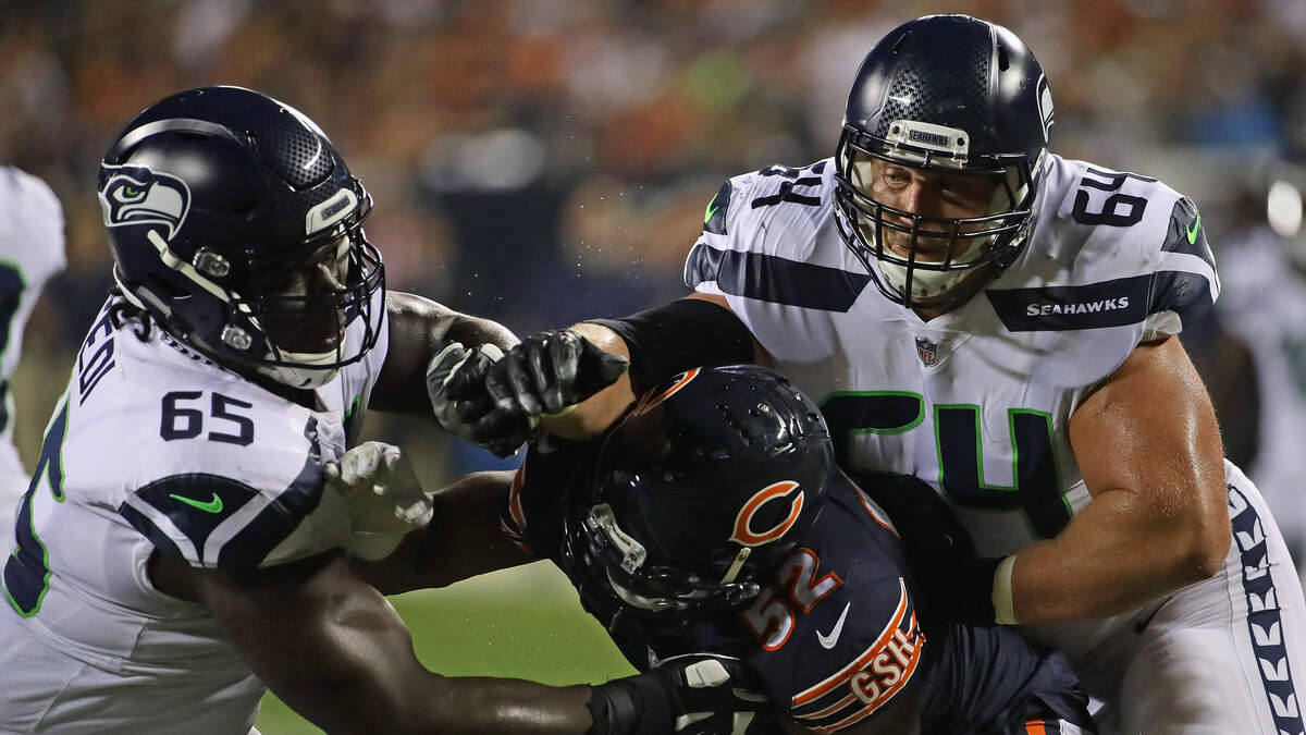 Photo Credit: CHICAGO, IL - SEPTEMBER 17: Khalil Mack #52 of the Chicago Bears between Germain Ifedi #65 (L) and J.R. Sweezy #64 of the Seattle Seahawks at Soldier Field on September 17, 2018 in Chicago, Illinois. The Bears defeated the Seahawks 24-17. (Photo by Jonathan Daniel/Getty Images)