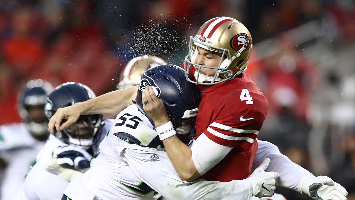Photo Credit: SANTA CLARA, CA - DECEMBER 16: Nick Mullens #4 of the San Francisco 49ers is hit by Frank Clark #55 of the Seattle Seahawks during their NFL game at Levi's Stadium on December 16, 2018 in Santa Clara, California. (Photo by Ezra Shaw/Getty Images)