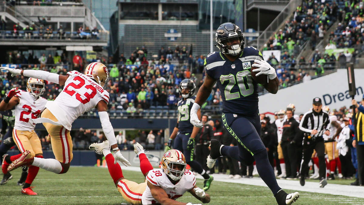 Photo Credit: SEATTLE, WA - DECEMBER 02: Rashaad Penny #20 of the Seattle Seahawks avoids a tackle by Antone Exum #38 of the San Francisco 49ers for a touchdown in the third quarter at CenturyLink Field on December 2, 2018 in Seattle, Washington. (Photo by Abbie Parr/Getty Images)