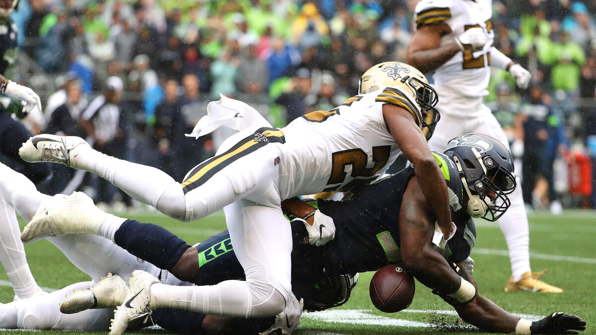 Photo Credit: SEATTLE, WASHINGTON - SEPTEMBER 22: Chris Carson #32 of the Seattle Seahawks fumbles the ball in a play that result in a 33 yard touchdown fumble recovery by Vonn Bell #24 of the New Orleans Saints in the second quarter during their game at CenturyLink Field on September 22, 2019 in Seattle, Washington. (Photo by Abbie Parr/Getty Images)
