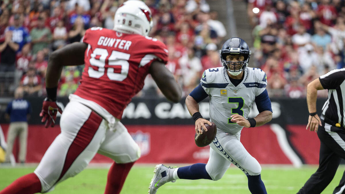 Photo Credit: GLENDALE, ARIZONA - SEPTEMBER 29: Quarterback Russell Wilson #3 of the Seattle Seahawks looks to make a pass in front of defensive tackle Rodney Gunter #95 of the Arizona Cardinals in the first half of the NFL game at State Farm Stadium on September 29, 2019 in Glendale, Arizona. (Photo by Jennifer Stewart/Getty Images)