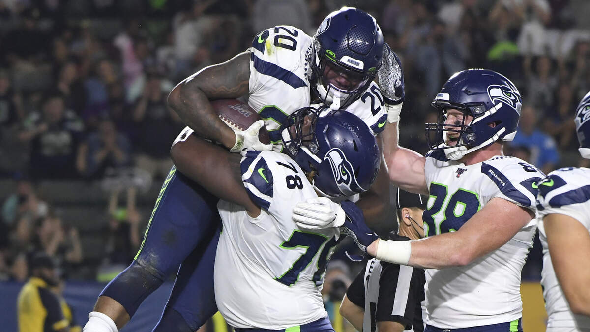 Photo Credit: CARSON, CA - AUGUST 24: Rashaad Penny #20 of the Seattle Seahawks is lifted into the air by D.J. Fluker #78 after scoring a Touchdown while Will Dissly #88 joins the celebration of during a pre-season NFL football game against the Los Angeles Chargers at Dignity Health Sports Park on August 24, 2019 in Carson, California. (Photo by John McCoy/Getty Images)