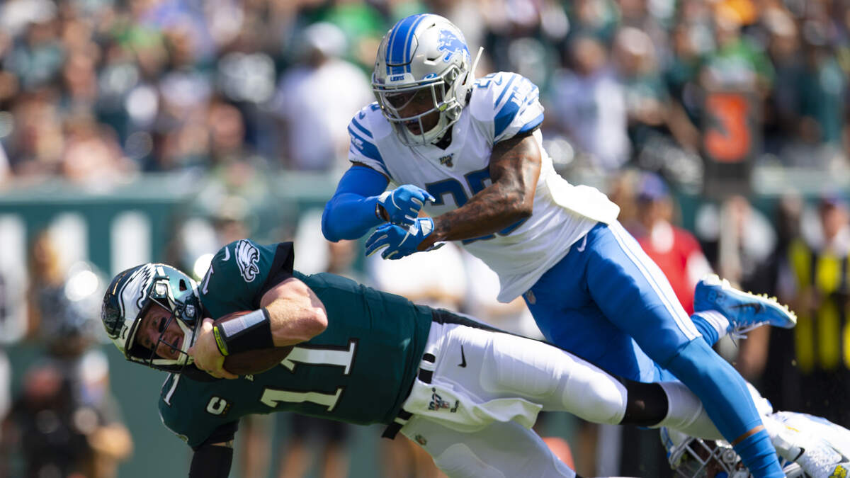 Photo Credit: PHILADELPHIA, PA - SEPTEMBER 22: Carson Wentz #11 of the Philadelphia Eagles runs with the ball and is hit by Quandre Diggs #28 of the Detroit Lions in the first quarter at Lincoln Financial Field on September 22, 2019 in Philadelphia, Pennsylvania. (Photo by Mitchell Leff/Getty Images)