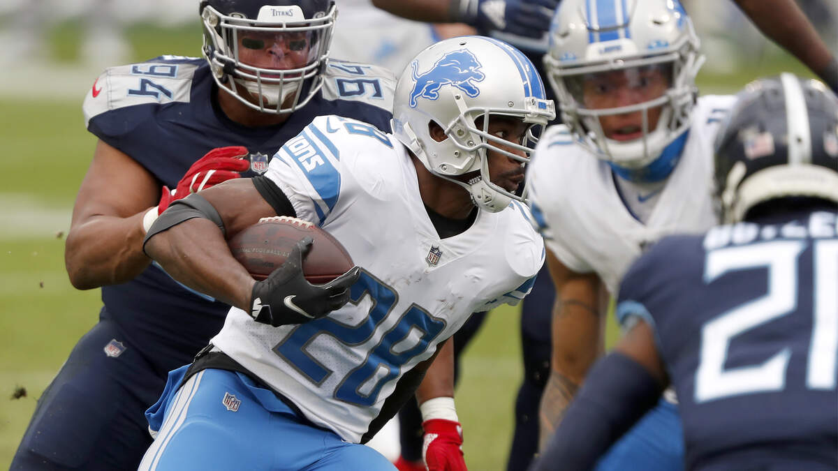 Photo Credit: NASHVILLE, TENNESSEE - DECEMBER 20: Running back Adrian Peterson #28 of the Detroit Lions carries the football against the defense of the Tennessee Titans during the second quarter of the game at Nissan Stadium on December 20, 2020 in Nashville, Tennessee. (Photo by Wesley Hitt/Getty Images)