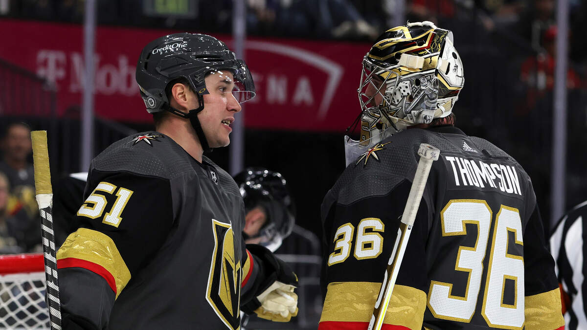 LAS VEGAS, NEVADA - MARCH 17: Derrick Pouliot #51 and Logan Thompson #36 of the Vegas Golden Knights talk during a break in the third period of their game against the Florida Panthers at T-Mobile Arena on March 17, 2022 in Las Vegas, Nevada. The Golden Knights defeated the Panthers 5-3. (Photo by Ethan Miller/Getty Images)Photo: Getty Images