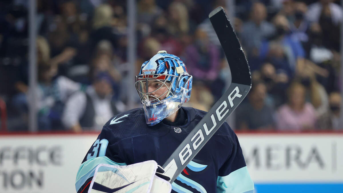 SPOKANE, WASHINGTON - SEPTEMBER 26: Philipp Grubauer #31 of the Seattle Kraken looks on in the second period against the Vancouver Canucks during a preseason game at Spokane Veterans Memorial Arena on September 26, 2021 in Spokane, Washington. (Photo by Abbie Parr/Getty Images)Photo: Getty Images
