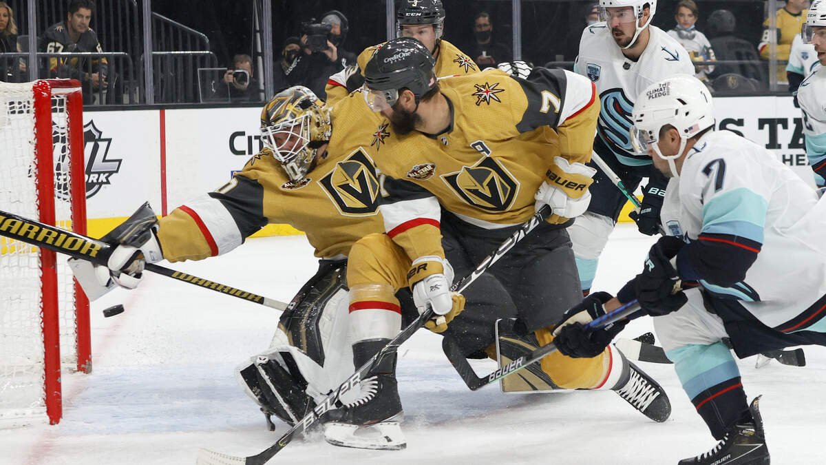 The Golden Knights, missing Max Pacioretty, Mark Stone, William Karlsson, Nolan Patrick, Zach Whitecloud and blockbuster trade pick-up Jack Eichel, won for the sixth time in eight games while scoring three goals in a span of 1:32 (Evgenii Dadonov and two goals by Reilly Smith) after Gourde’s third goal of the year gave the Kraken a 2-1 lead late in the second period.
