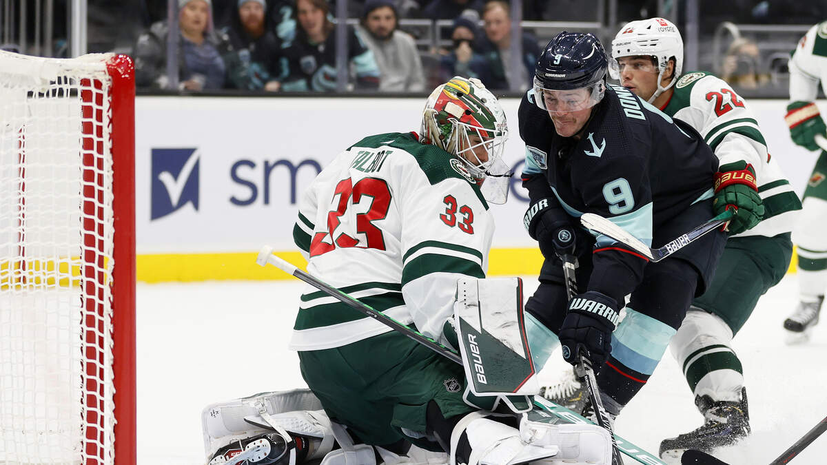 SEATTLE, WASHINGTON - NOVEMBER 13: Ryan Donato #9 of the Seattle Kraken has his shot stopped by Cam Talbot #33 of the Minnesota Wild during the second period on November 13, 2021 at Climate Pledge Arena in Seattle, Washington. (Photo by Steph Chambers/Getty Images)Photo: Getty Images