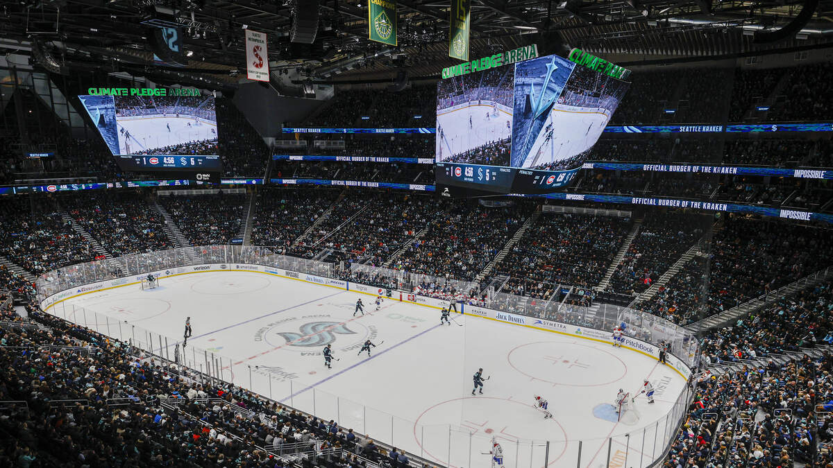 SEATTLE, WASHINGTON - OCTOBER 26: A general view with the center ice logo is seen during the third period between the Seattle Kraken and the Montreal Canadiens on October 26, 2021 at Climate Pledge Arena in Seattle, Washington. (Photo by Steph Chambers/Getty Images)Photo: Getty Images