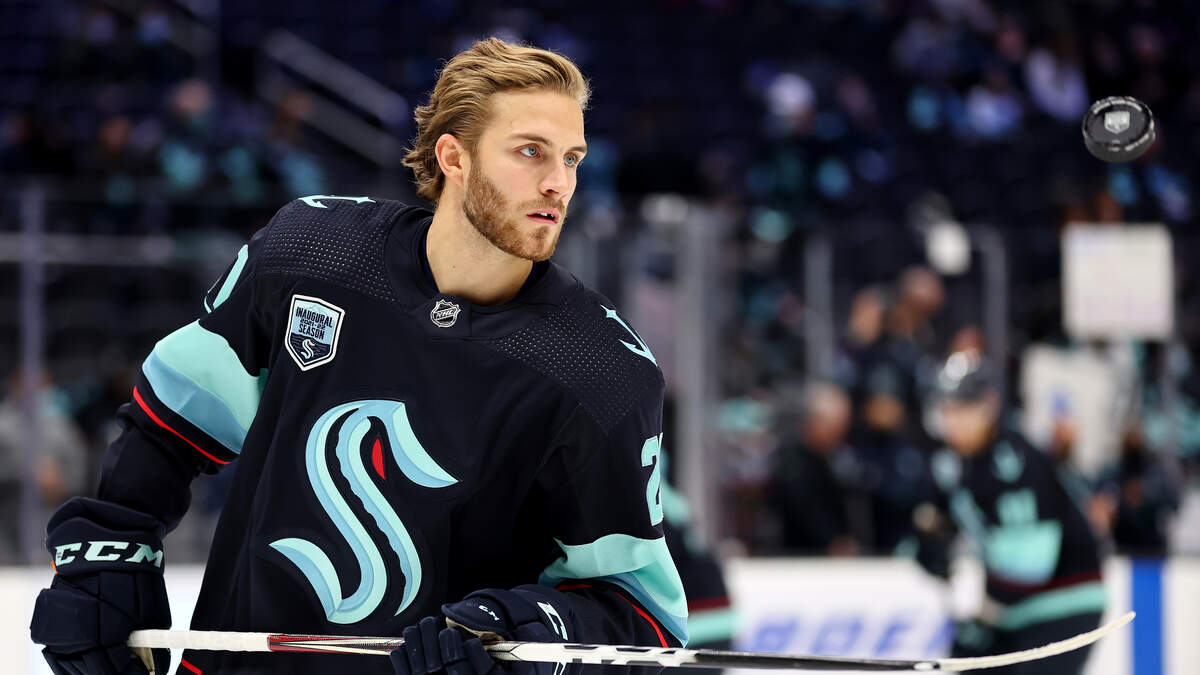 SEATTLE, WASHINGTON - DECEMBER 29: Alex Wennberg #21 of the Seattle Kraken warms up before the game against the Philadelphia Flyers at Climate Pledge Arena on December 29, 2021 in Seattle, Washington. (Photo by Steph Chambers/Getty Images)Photo: Getty Images