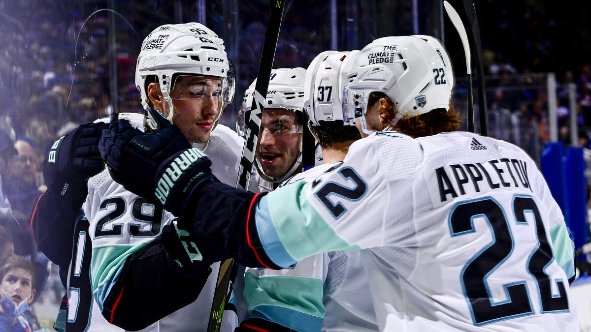 Jared McCann’s sharp angled shot from the base of the right circle caromed off Semyon Varlamov for a 1-0 lead at 6:04 of the third period to break a scoreless tie and Vince Dunn’s sizzling backhander just 2:31 later put the Kraken up 2-0.