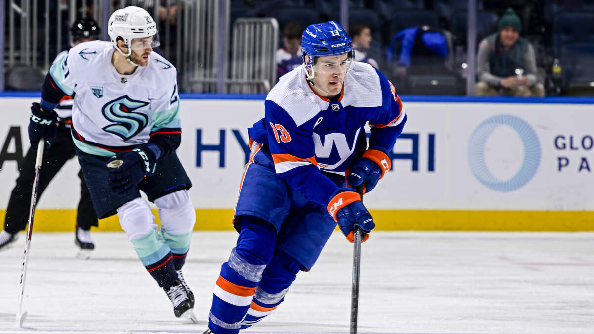 ELMONT, NEW YORK - FEBRUARY 02: Mathew Barzal #13 of the New York Islanders carries the puck against the Seattle Kraken during the second period at UBS Arena on February 02, 2022 in Elmont, New York. (Photo by Steven Ryan/Getty Images)Photo: Getty Images