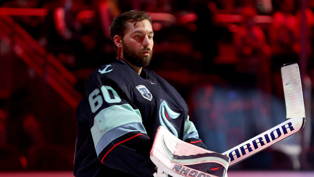 SEATTLE, WASHINGTON - DECEMBER 30: Chris Driedger #60 of the Seattle Kraken looks on before the game against the Calgary Flames at Climate Pledge Arena on December 30, 2021 in Seattle, Washington. (Photo by Steph Chambers/Getty Images)Photo: Getty Images