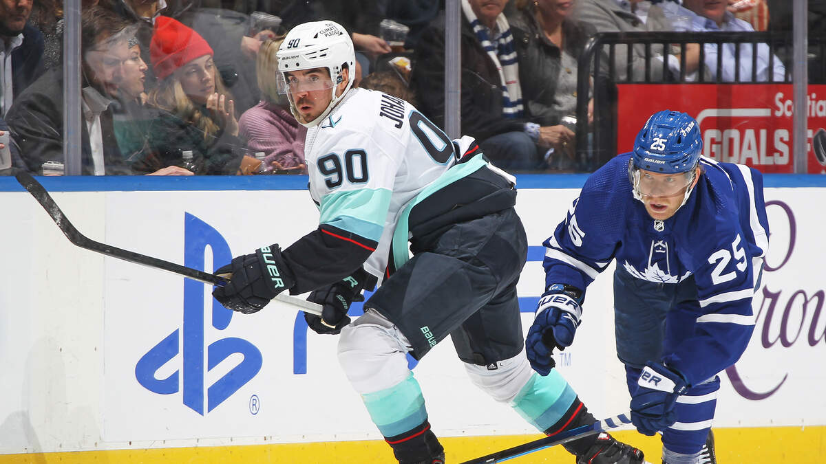 TORONTO, ON - MARCH 8: Marcus Johansson #90 of the Seattle Kraken skates against Ondrej Kase #25 of the Toronto Maple Leafs at Scotiabank Arena on March 8, 2022 in Toronto, Ontario, Canada. The Maple Leafs defeated the Kraken 6-4. (Photo by Claus Andersen/Getty Images)Photo: Getty Images