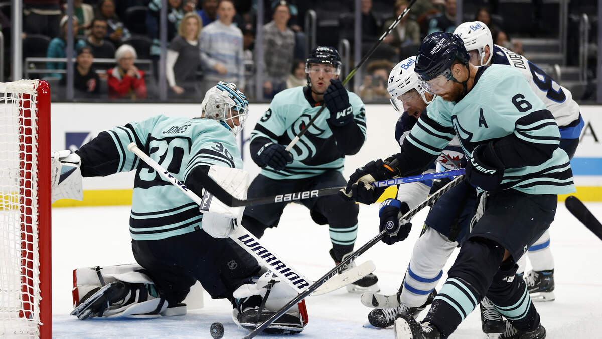 The Kraken dropped their third overtime loss of the season, this one in excruciatingly painful fashion, 3-2 to the Jets on Sunday when victory was 3.9 seconds away, only to see Winnipeg score a six-on-four, extra attacker goal before the final horn .What led to the goal: Carson Soucy was whistled for roughing (and fined $2,500 by the league on Monday) for a sucker punch to the head on Pierre-Luc Dubois, after several visible seconds of physical jockeying between the two at Martin Jones’ net.