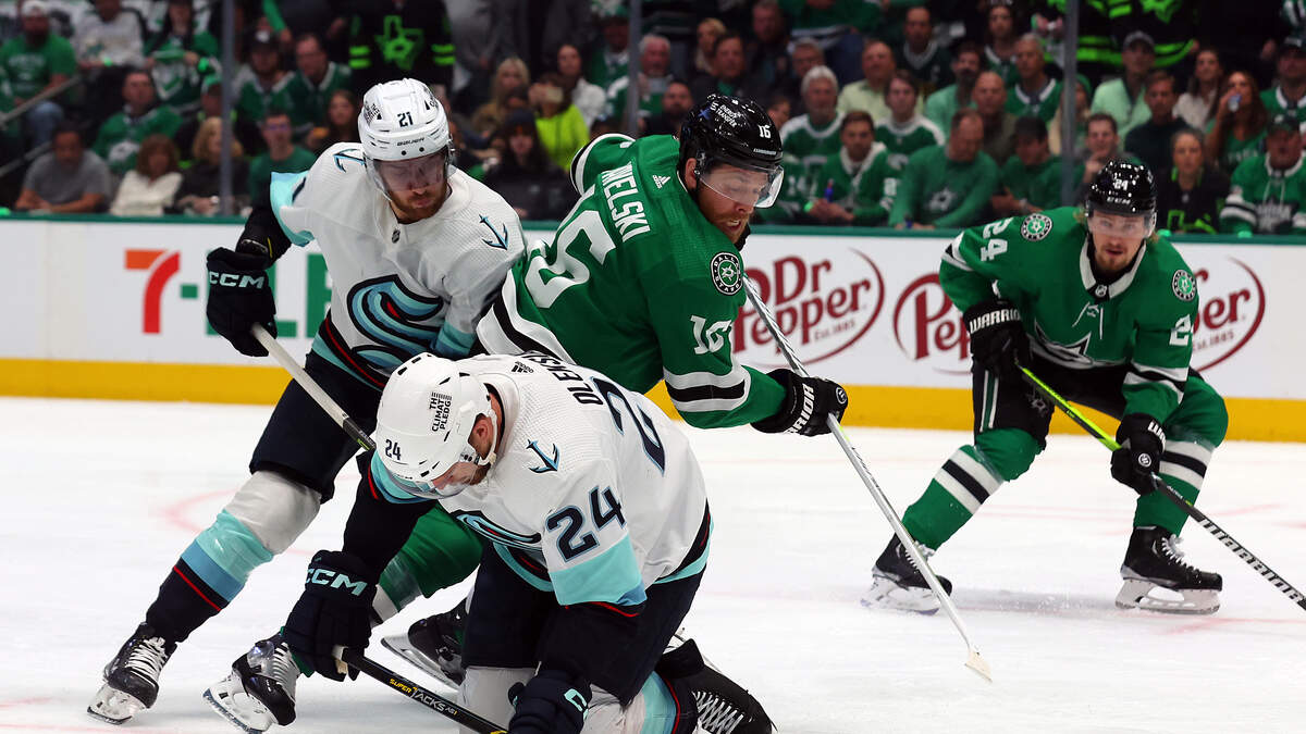 DALLAS, TEXAS - MAY 15: Alex Wennberg #21 and Jamie Oleksiak #24 of the Seattle Kraken battle Joe Pavelski #16 of the Dallas Stars for the puck in the first period in Game Seven of the Second Round of the 2023 Stanley Cup Playoffs at American Airlines Center on May 15, 2023 in Dallas, Texas. (Photo by Richard Rodriguez/Getty Images)Photo: Getty Images