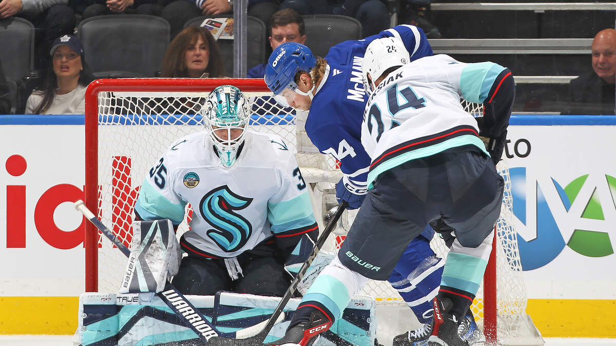 TORONTO, CANADA - OCTOBER 31: Joey Daccord #35 of the Seattle Kraken stops Bobby McMann #74 of the Toronto Maple Leafs during the Third period in an NHL game at Scotiabank Arena on October 31, 2024 in Toronto, Ontario, Canada. The Maple Leafs defeated the Kraken 4-1. (Photo by Claus Andersen/Getty Images)Photo: Claus Andersen / Getty Images Sport / Getty Images
